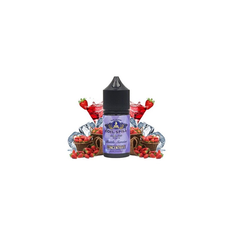 El aroma concentrado Bottle Service de Coil Spill es su famoso champagne con fresas añadiendo un golpe de mentol, para vapear su burbujeante sabor como recién salido de la cubitera.