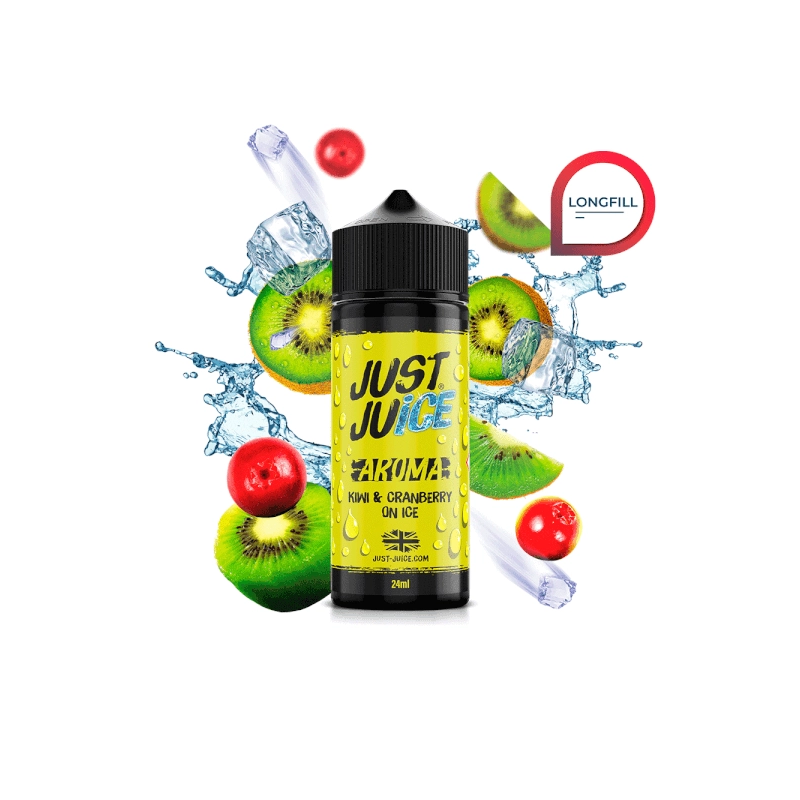 Just Juice Iconic Kiwi Cranberry On Ice Longfill 24ml, es un e-liquid de aroma ultra concentrado combina la dulzura del kiwi con la acidez del arándano rojo, complementada con un toque fresco.
