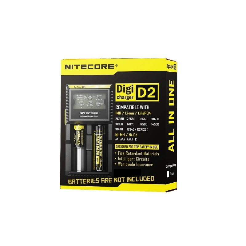 El Nitecore D2 es un cargador inteligente universal, compatible con casi todas las baterías recargables cilíndricas, eliminando así la necesidad de poseervarios cargadores. El D2 detecta automáticamente Li-ion, las baterías de Ni-MH y Ni-Cd, y por medio de la selección manual también es capaz de cargarbaterías LiFePO4. De circuito de carga inteligente selecciona el modo de carga óptima (CC, CV y dV / dt) para una batería dado y cada uno de dos monitoresmicroordenador controlado ranuras de carga luego de la D2 y carga la bateríade forma independiente. Además, una pantalla LCD digital integradoclaramente muestra progreso, tensión, corriente y tiempo de carga, mientras que una función de apagado automático inteligente termina corriente cuando la carga está completa. El Nitecore D2: más avanzado cargador digital totalmente automático del mundo. Es tan simple como insertar, detectar ycargo.